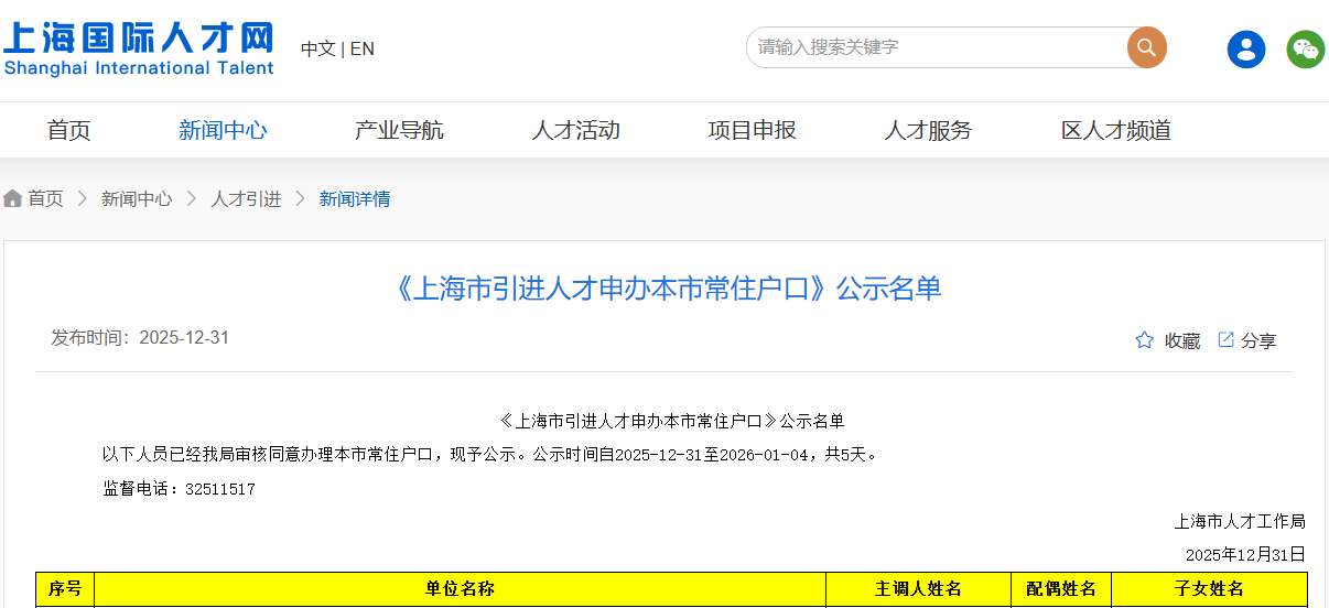 2025年11月28日,上海国际人才网发布了《上海市引进人才申办本市常住户口》公示名单,公示时间及公示人数来看下文。