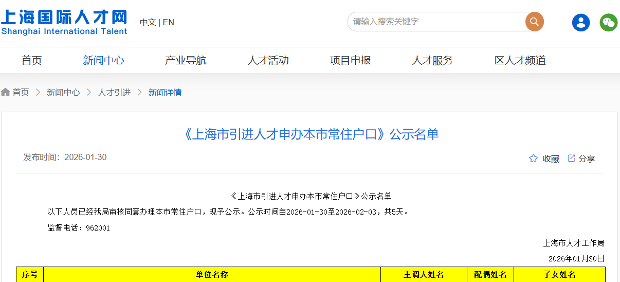 上海人才引进栏目为您分享:上海国际人才网发布了2026年1月第一期《上海市引进人才申办本市常住户口》公示名单,公示时间自2026-01-30至2026-02-03,共5天,详细内容来看下文!
