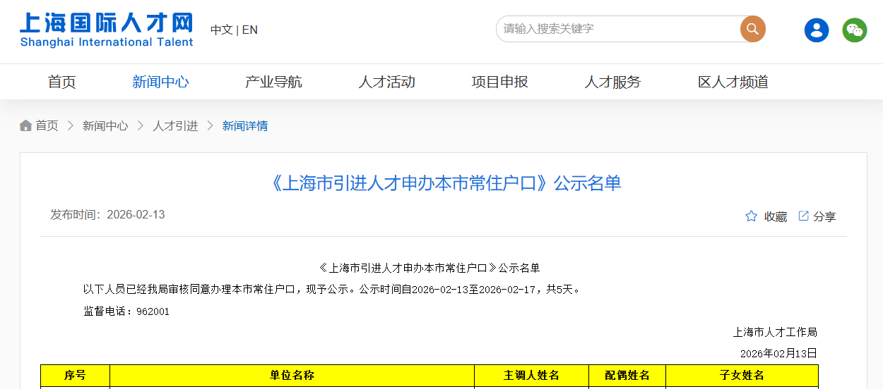 上海人才引进栏目为您分享:上海国际人才网发布了2026年2月第二期《上海市引进人才申办本市常住户口》公示名单,公示时间自2026-02-13至2026-02-17,共5天,详细内容来看下文!